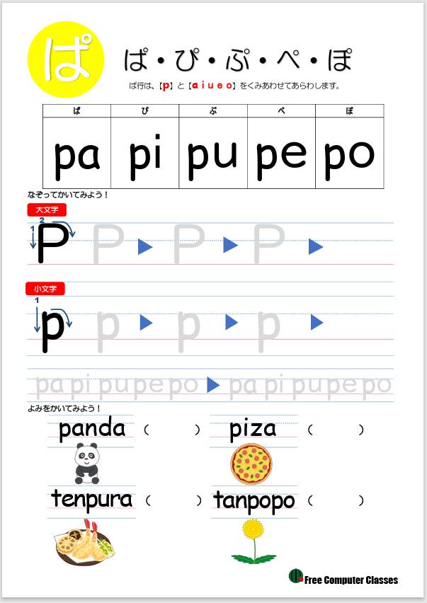 ぱ行は、子音が【p】で母音が【a i u e o】で「ぱぴぷぺぽ」になります。